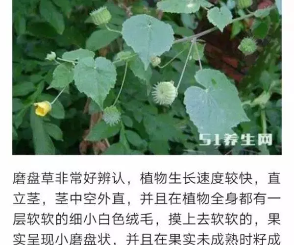 磨盘草,中药名。为锦葵科植物磨盈草的全草,其味甘,淡;性凉。有疏风清热,化痰止咳,消肿解毒之功效。用于感冒,发热,咳嗽,泄泻,中耳炎,耳聋,咽炎,腮腺炎,尿路感染,疮痈肿毒,跌打损伤。
