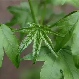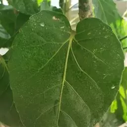 叶螺旋状排列,广卵形至长椭圆状卵形,长6-18cm,宽5-9cm,先端渐尖,基部心形,两侧常不相等,边缘具粗锯齿,不分裂或3-5裂,小树之叶常有明显分裂,表面粗糙,疏生糙毛,背面密被绒毛,基生叶脉三出,侧脉6-7对;叶柄长2.5-8cm,密被糙毛;托叶大,卵形,狭渐尖,长1.5-2cm,宽0.8-1cm。