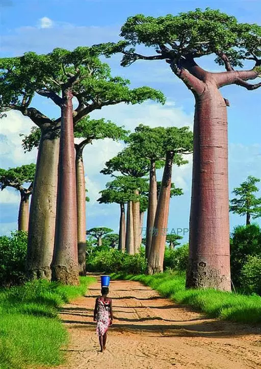 马达加斯加岛观赏猴面包树最著名的景点是位于 坦桑尼亚生长的猴面包树与大象的体型对比 岛西部距离首都700多公里左右的穆隆达瓦地区,驱车先南下途经安齐拉贝再拐向西到芒里瓦褚镇,从该镇开始路况变得颠簸崎岖,雨季期间(每年的12月到3月上旬),一般只有四驱越野车方能通行,交通巴士也有,但是剩下不到300公里的路还需要行车约10个小时,路况可见一斑了。