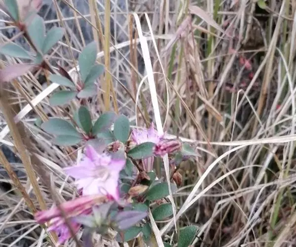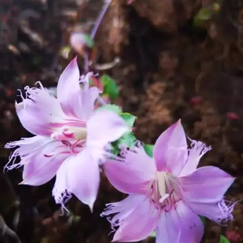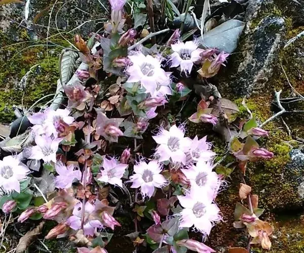 红花龙胆(Gentiana rhodantha Franch. ex Hemsl. )多年生草本,具短缩根茎。根细条形,黄色。茎直立。基生叶呈莲座状,椭圆形、倒卵形或卵形;茎生叶宽卵形。花单生茎顶,无花梗;花萼膜质,有时微带紫色;花冠淡红色,上部有紫色纵纹,筒状,上部稍开展;雄蕊着生于冠筒下部,花丝丝状,花药椭圆形;子房椭圆形。蒴果内藏或仅先端外露,淡褐色,长椭圆形,两端渐狭,果皮薄,种子淡褐色,近圆形,具翅。花果期10月至翌年2月。