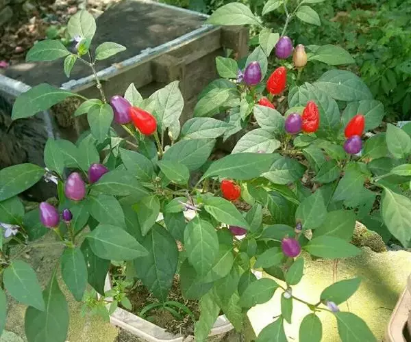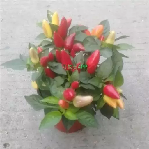 五色椒又名朝天椒,五彩辣椒,为辣椒 变种,味涩。属茄科多年生半木质性植物,常作一年生栽培;江苏沭阳一带有不少花农种植,其株高30厘米—60厘米,分枝多、茎直立,单叶互生;花白色,开花期5月初—7月底,果实簇生于枝端。同一株果实有红、黄、紫、白等颜色,有色泽,盆栽观赏很逗人喜爱,也可食用,风味同青椒。 辣椒果色鲜艳,点缀在绿叶中,灵巧可爱。可以单株培植于小盆中或数株合植于稍大的盆中,陈设于客厅、卧室或厨房,装饰效果非常好。全草入药,根茎性温、味甘,能祛风散寒,舒筋活络并有杀虫、止痒功效。植株对空气中的二氧化硫和三氧化硫等有毒气体有一定的吸收和抵抗能力。