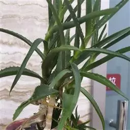 多年生肉质植物。株高20~30厘米,具短茎,肉质叶自根际长 翠花掌 出,呈三出覆瓦形排列,旋叠状生长,叶片三角剑形,肥厚多肉,表面下凹呈"V"形,叶长约12厘米,宽3~5厘米,叶缘密生白色肉质刺,叶色深绿,有横向排列不规则的银白色或灰白色斑纹。总状花序腋生,长30厘米 ,有小花20~30朵,花朵筒状,橙红或橙黄色。