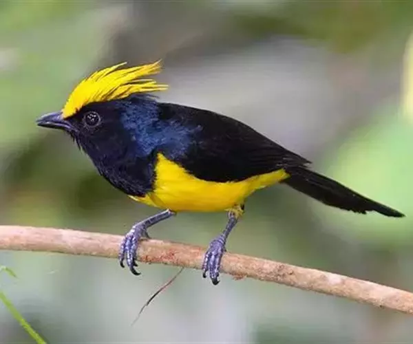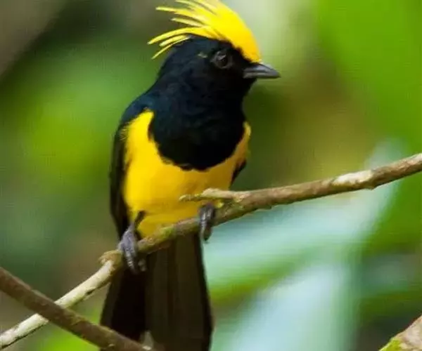 雌鸟额、头顶和羽冠亦为黄色,但羽色较暗淡而少光泽;头侧、枕后颈、颈侧、背、肩和尾上覆羽橄榄绿色。颏、喉、胸暗黄橄榄色,下余下体黄色,两翅和尾黑色微沾绿色。幼鸟和雌鸟相似,但羽冠不及成鸟长而显著。