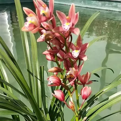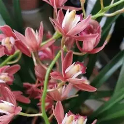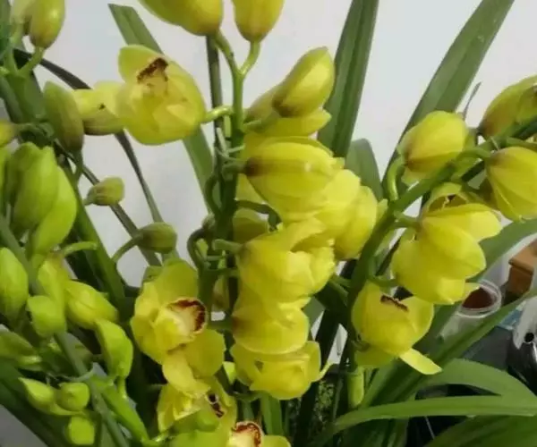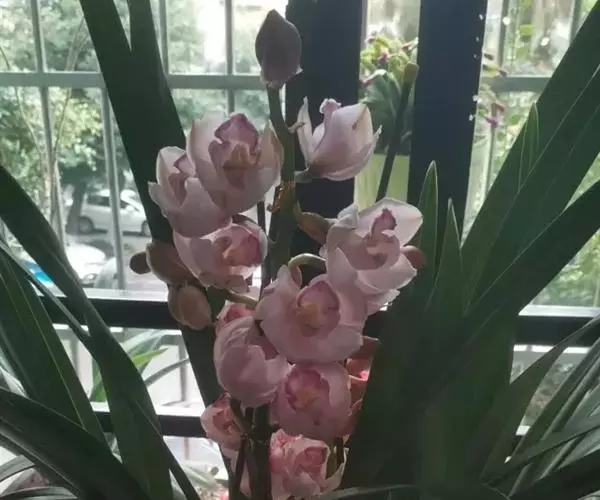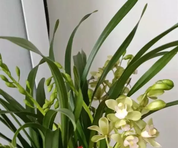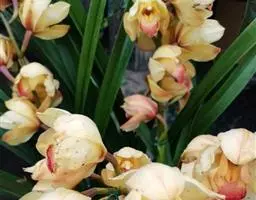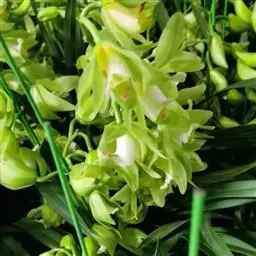 (6)大花蕙兰的花:开花期养分不足或高温或温差大于10℃易造成落花落蕾。深色花喜强光,弱光下容易出现垂叶现象。