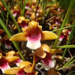 莎叶兰:地生或半附生植物;假鳞茎较小,长1-2厘米,包藏于叶鞘之内。叶4-12枚,带形,常整齐2列…