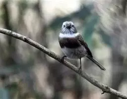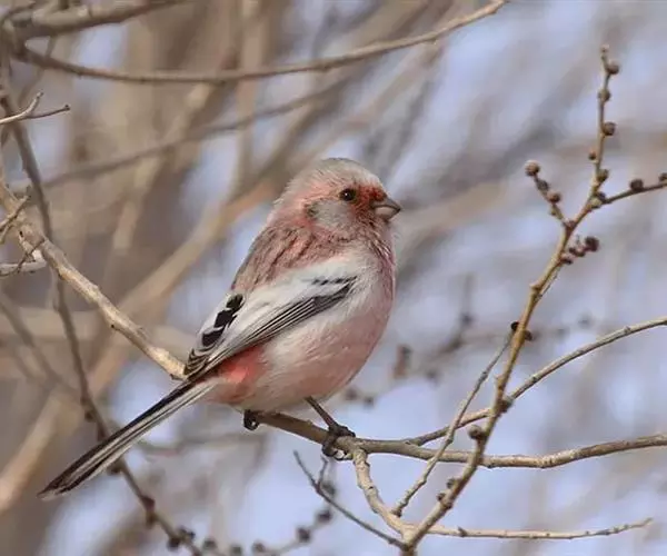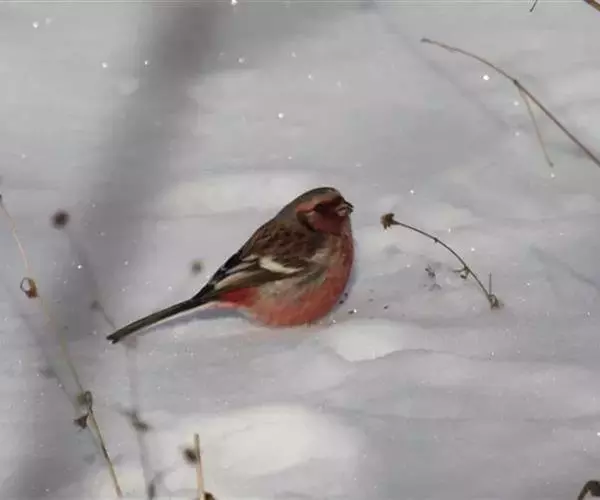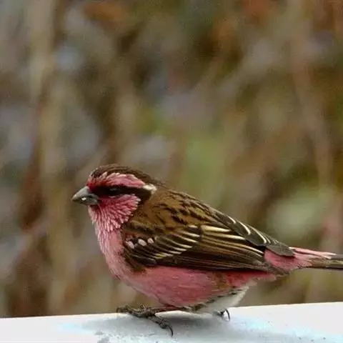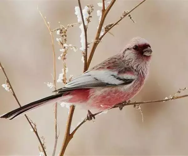 长尾朱雀(学名:Carpodacus sibiricus):体长18厘米,体重16-26克。雄鸟额、颏和眼后为暗红色,头顶与后颈的羽端较淡;翼羽具宽阔的白色边缘与先端;形成鲜明的翼斑;外侧尾羽白色,嘴短粗呈膨胀状;雌鸟无红色,头、颊到翕带灰色,具暗色斑纹;翼斑宽白;腰部橙褐色。