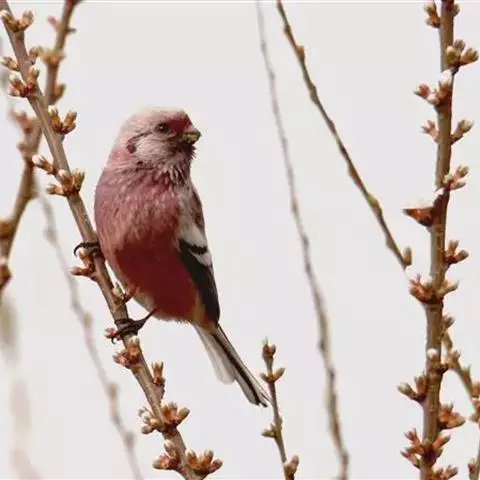 北朱雀,是燕雀科朱雀属鸟类。雄鸟额和头顶前部珠白色具窄的粉红色羽缘,…