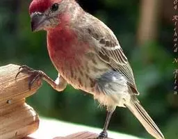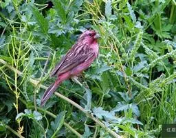 红腰朱雀:体长12-14厘米,小型鸟类。雄鸟前额和眉纹玫瑰粉红色,头顶和一宽的贯眼带深红褐色,背红…