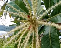 雄花序穗状或圆锥花序,花序轴无毛,花被片内面被疏柔毛;雌花的花柱3或2枚。果序轴横切面径2-5毫米;壳斗有1坚果,阔卵形,顶狭尖或钝,连刺径长20-30毫米,2-4瓣开裂,壳壁厚约1毫米,刺长6-10毫米,壳斗顶部的刺密集而较短,通常完全遮蔽壳斗外壁,刺及壳壁被灰白色或灰黄色微柔毛,若壳斗近圆球形,则刺较疏少,近轴面无刺;坚果阔圆锥形,顶部锥尖,宽10-14毫米,无毛,果脐位于坚果的底部。花期4-6月,果次年9-11月成熟。