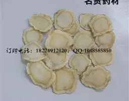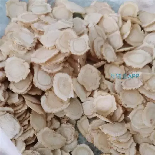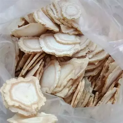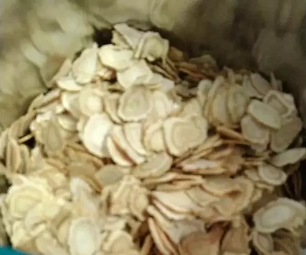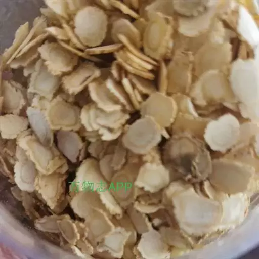 西洋参片 主根呈圆形或纺锤形,芦头残存或已除去,残存者,略偏向一侧;表面呈浅黄色或黄白色,皮纹细腻,具有突起的横长皮孔;质地饱满而结实。折断面略显角质,皮部与木部或中心常有小裂隙。断面呈粉白色,皮部可见一棕色形成层环,环内外散有红棕色小点;苦干味浓,透喉。