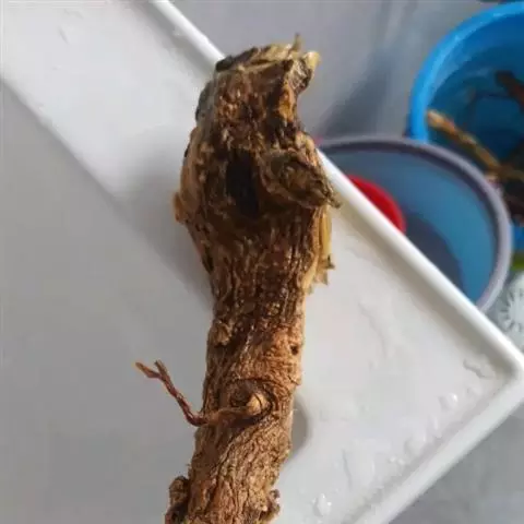 呈长圆柱形,枝条较粗壮,芦头较大;表面较光滑,颜色偏黑,纵纹明显;质地轻,似刚出窑的红砖,粉性差,少有裂开的隙缝;仅有苦味,甘味少或无,久嚼有棉絮感。
