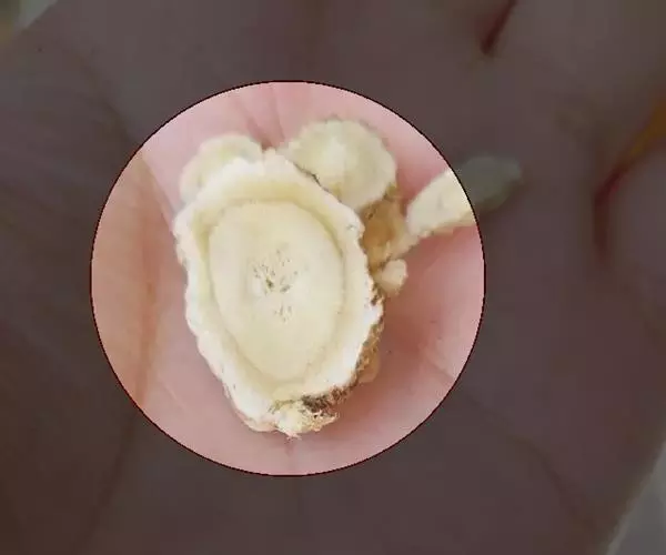 外形同西洋参。折断面灰白色,形成层环扩散成暗棕红色,韧皮部仍可见红棕色小点,干枯不显油性。