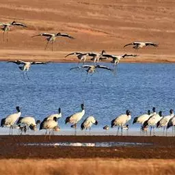 黑颈鹤:是鹤科、鹤属的大型涉禽,体长110-120厘米,体重4-6千克。颈、脚甚长,通体羽毛灰白色,…