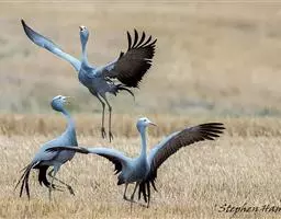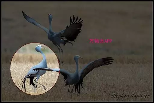 蓝鹤一般在春天筑巢孵蛋,通常一窝蛋只有两枚。有时这两枚蛋就直接产在光秃秃的地面上。但如果仔细观察,你会在蛋的底部发现一层不很明显的、薄薄的垫子。它是由干草、动物排泄物,甚至小石头等物构成的。在我观察过的一个鹤巢里,就发现有几百件这样的小东西。蓝鹤应该属于在繁殖期会变得特别醒目而漂亮的鸟类之一。而且看来在选址筑巢方面,它们显然十分粗心,过于草率。因为它们用于孵蛋的鸟巢总是筑在毫无遮掩的平地上。此外,它们全身的羽毛也毫无伪装。在这方面它们跟其他一些同样喜欢在平地上筑巢孵蛋的大型鸟类相比,如斯坦利的地鵏(Stanley’s Bustard),就大不一样。通常,人们在大约一公里之外就可以发现正在孵蛋的蓝鹤。