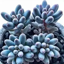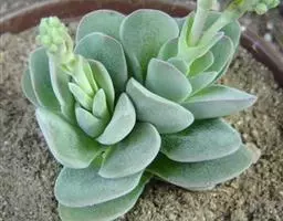 蓝黛莲是一种景天科厚叶草属植物。叶片呈略扁的圆柱形,排列成莲座状;颜色为灰绿色,…