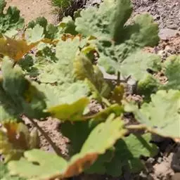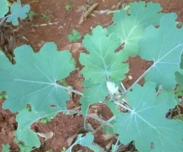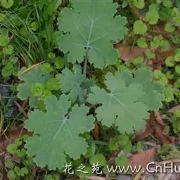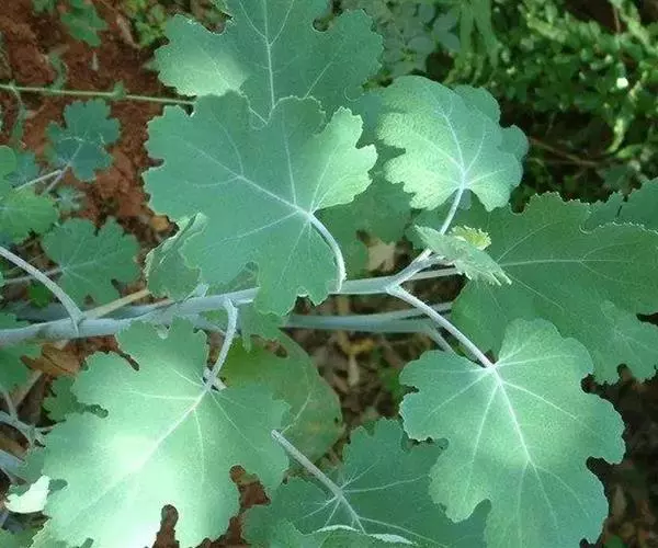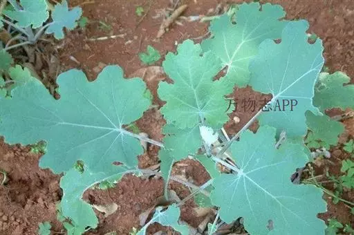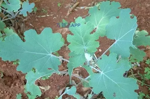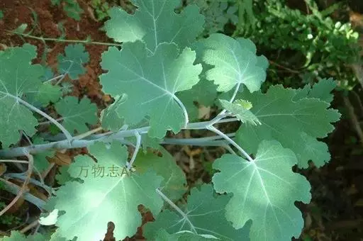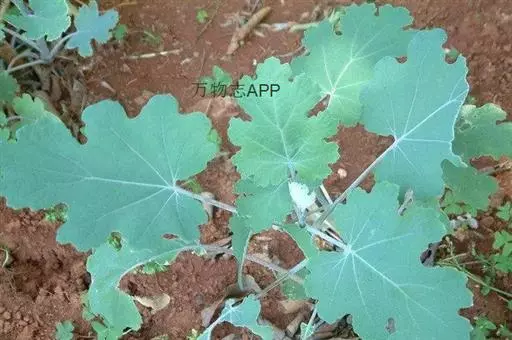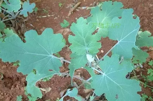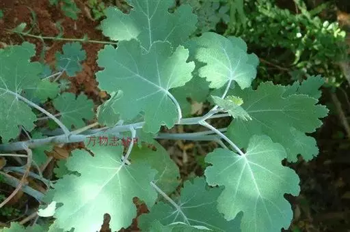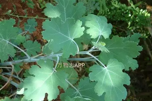 直立草本,基部木质化,具乳黄色浆汁。茎高0.8-1米,通常淡黄绿色,光滑,多白粉,中空,上部多分枝。叶片宽卵形或近圆形,长5-14厘米,宽5-12厘米,先端急尖、钝或圆形,基部心形,通常7或9深裂或浅裂,裂片半圆形、扇形或其他,边缘波状、缺刻状、粗齿或多细齿,表面绿色,无毛,背面多白粉,被绒毛,基出脉通常5,侧脉1对,稀2对,细脉网状;叶柄长4-11厘米,上面平坦,通常不具沟槽。