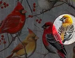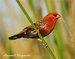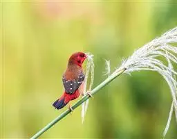 红梅花雀小型鸟类,体长9-10厘米。雄鸟通体朱红色,背、肩、胸等满布白色小斑点,…