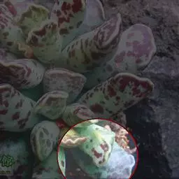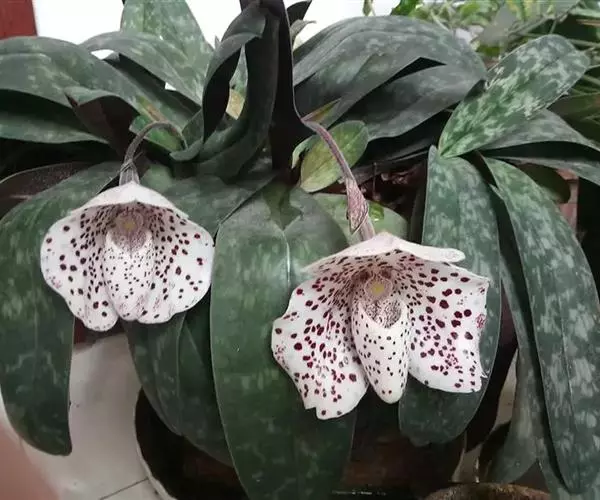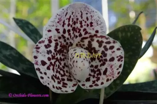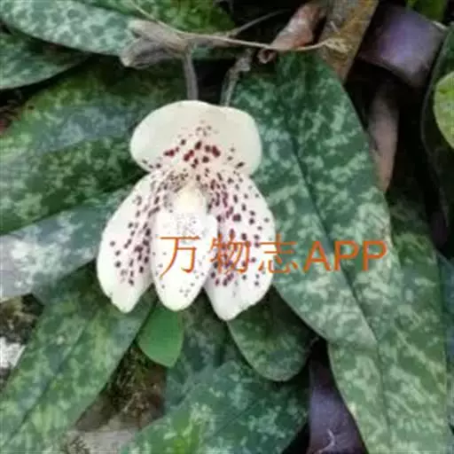 地生或半附生植物,通常较矮小。叶基生,二列,4-5枚;叶片狭椭圆形或长圆状椭圆形,长14-18厘米,宽5-6厘米,先端钝并有不对称的裂口,上面有深浅绿色相间的网格斑,背面密布紫色斑点,中脉在背面略呈龙骨状突起,基部略收狭成柄并对折而互相套叠。