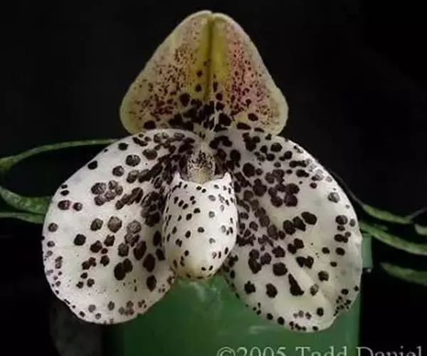 花葶直立,很短,长一般不超过10厘米,紫褐色,被长柔毛,顶端生1花;花苞片卵形,长2.2-2.6厘米,宽1.5-2厘米,先端急尖,背面中脉稍被毛,边缘具细缘毛;花梗和子房长3-3.5厘米;花直径6-7厘米,白色或带淡黄色,具紫红色或紫褐色粗斑点,仅退化雄蕊上的斑点较细;中萼片横椭圆形至宽卵形,长3-3.5厘米,宽3.5-4厘米,先端浑圆或钝并常有短尖头,背面被短柔毛并有龙骨状中脉;合萼片明显小于中萼片,长2-2.5厘米,宽2.5-3厘米,背面也有短柔毛;花瓣巨大,宽椭圆形或宽卵状椭圆形,长5-6厘米,宽3-4.5厘米,边缘有细缘毛;唇瓣深囊状,椭圆形,有时向末端稍变狭,长2.5-4厘米,宽1.5-2厘米,基部具很短的爪,囊口宽阔,整个边缘内弯,但前方内弯边缘狭窄,囊底有毛;退化雄蕊近圆形或略带方形,长8-11毫米,宽8-9毫米,先端钝或略有3齿。花期4-6月。