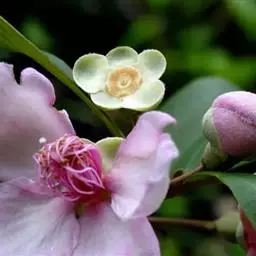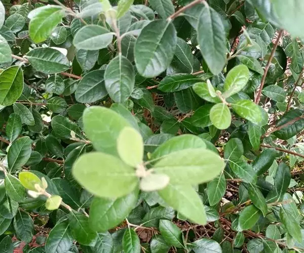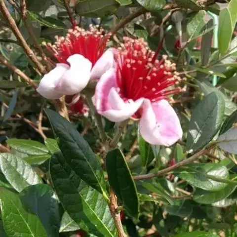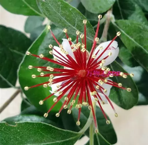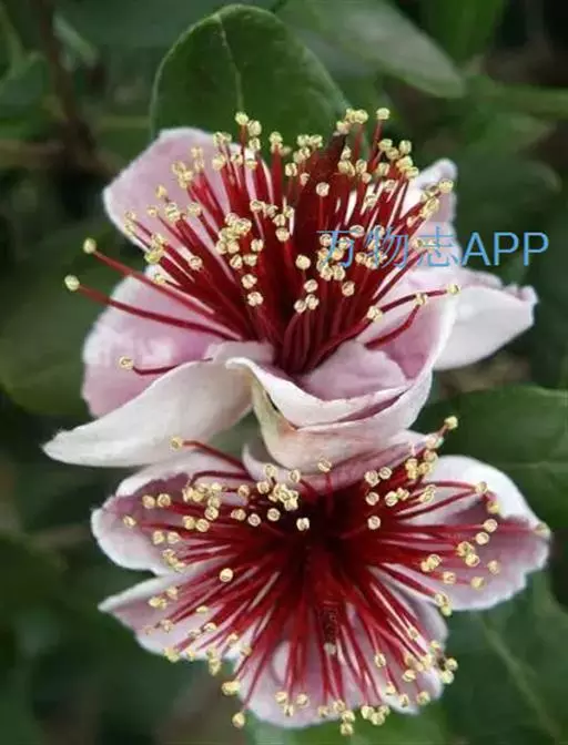 叶厚革质,椭园形对生,长5-7cm,深绿色,具油脂光泽,四季常绿。叶背面有银灰色细绒毛。枝叶修剪时散发出令人愉快的芳香,有益人体健康。花单生,花辨倒卵形,紫红色,外被白色绒毛。花两性,雄蕊和花柱红色,顶端黄色,花色艳丽,且可食用。