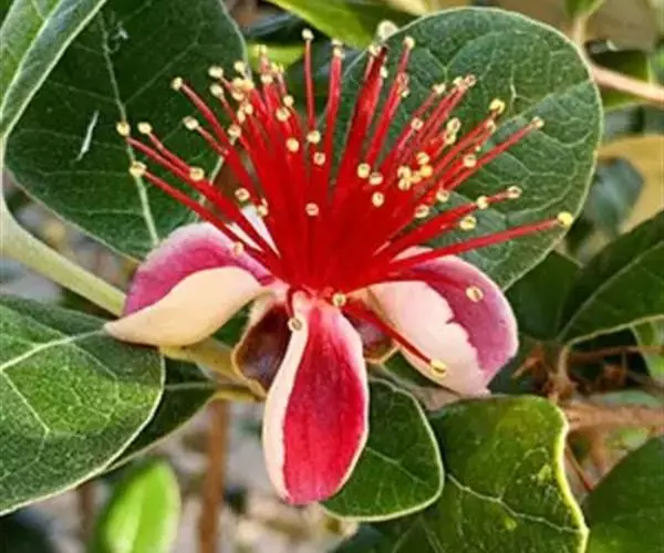 菲油果高可达5~6 m,树皮呈浅灰色,枝节间膨胀,幼时有白毛;枝叶深绿发亮,叶厚革质,对生,椭圆形,长5~7.5 cm,叶背面有银灰色的茸毛;花单生或簇生,花径4 cm,花形奇特,花瓣为倒卵形,花瓣4~6瓣,花瓣背面白色,内带紫色,花两性,自花授粉,花柱和雄蕊红色,顶端黄色;花期为5月下旬至6月上旬 。浆果,长椭圆形至卵形,大小如猕猴桃,长2.5~7 cm,果皮蜡质,光亮,暗绿色,成熟时略微带红色,果期为深秋至初冬,熟时果肉为黄色,半透明状,果汁丰富;种子较小,埋于果肉当中,可食,有香蕉和草莓的香甜味道。