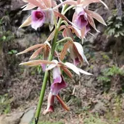 无距虾脊兰:假鳞茎近圆锥形,粗约1厘米,具3-4枚鞘和2-3枚叶。叶在花期尚未完全展开,…