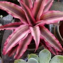 彩叶凤梨 L.B.Sm.) 凤梨科多年生常绿草本。株高25-30厘米,茎短。叶革质,带状,常基生,…