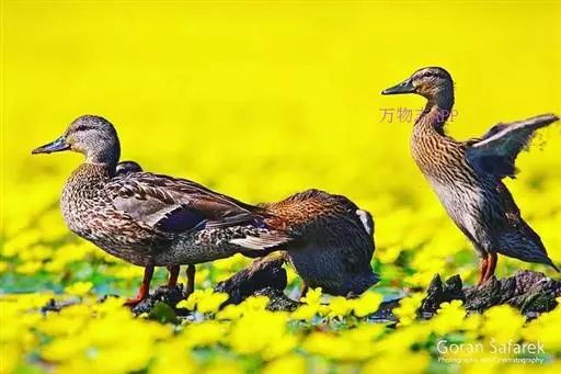 斑嘴鸭:羽褐色,上嘴黑,端有黄斑,翼镜紫蓝。