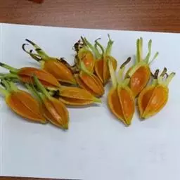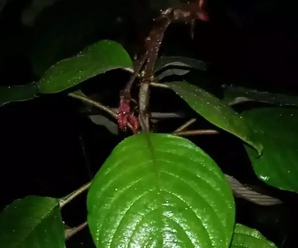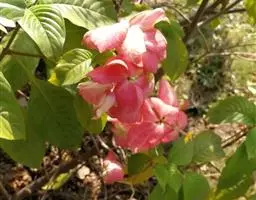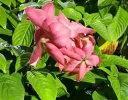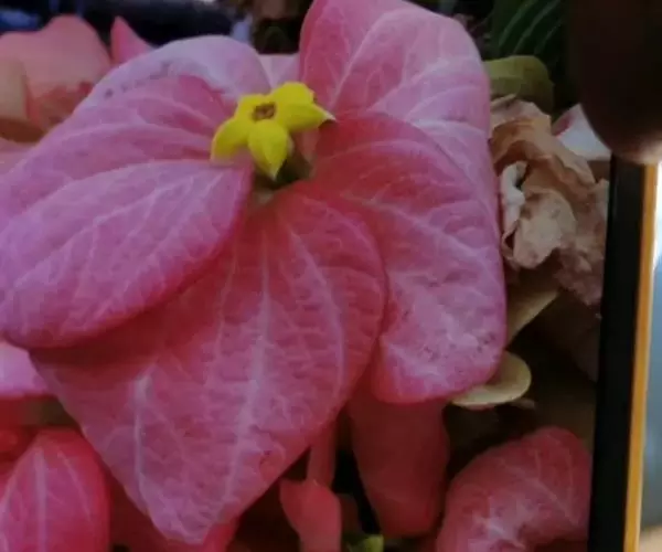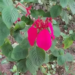 常绿或半落叶直立性或攀缘状灌木,叶纸质,披针状椭圆形,长7~9cm,宽4~5cm,顶端长渐尖,基部渐窄,两面被稀柔毛,叶脉红色。聚伞花序。花冠五角星状,黄色。一些花的一枚萼片扩大成叶状,深红色,卵圆形,长3.5~5cm。顶端短尖,被红色柔毛,有纵脉5条。株高1-1.5m