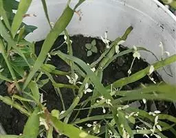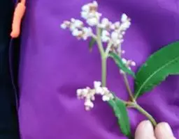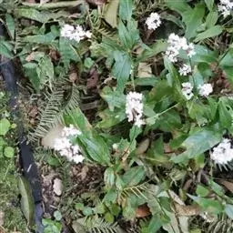 伞房状聚伞花序,顶生,苞片长圆形,薄膜质,花梗长4-5毫米,顶部具关节,无毛,比苞片长;花被5深裂,稀4深裂,白色或淡黄色,被片宽倒卵形,长4-5毫米,不相等;雄蕊6-8, 花药紫色;花柱3, 柱头头状。