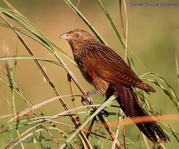 小鸦鹃幼鸟头、颈和上背暗褐色,具白色羽干和棕色羽缘;腰至尾上覆羽为棕色和黑色横斑相间状,尾淡黑色,具棕色端斑。中央尾羽具棕白色横斑和棕色端斑。下体淡棕白色,羽干白色,胸和两胁暗色,两胁具暗褐色横斑。两翅栗色,翼下覆羽淡栗色,且杂有暗色细纹。