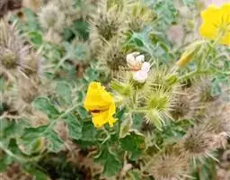 能孕花单生,花柄长约1-1.8厘米,毛被较密,花后常下垂,不孕花蝎尾状与能孕花并出;萼近钟形,直径约2.5厘米或稍大,外面密被与花梗相似的星状绒毛及小皮刺,皮刺长约3毫米,萼裂片披针形,先端锐尖,内面疏被星状绒毛,花冠辐状,外面星状毛被较密,内面仅裂片先端疏被星状绒毛,花冠筒长约2毫米,冠檐长约2.1厘米,裂片三角形,长约1厘米;花丝长约2.5毫米,花药长约7.5毫米;子房圆形,顶端密被星状毛,花柱长4-7毫米,中部以下被星状绒毛,柱头浅裂。