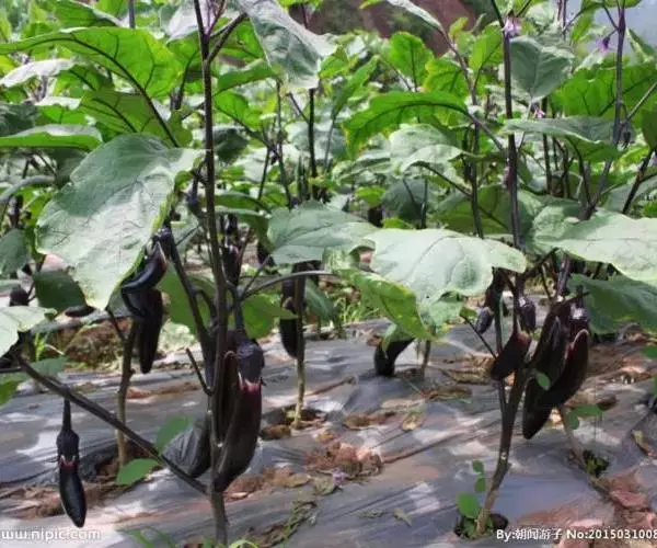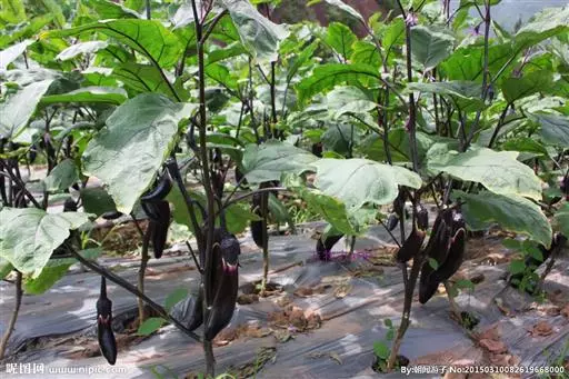 ⑶剪枝:茄子是双杈分枝作物,一般双干整枝,即对茄以上留两个枝条,每枝留一个茄,每层留两个茄。每级发出的侧枝在茄子长到一半大时留2-3片叶摘心。