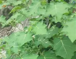 叶大,卵形至长圆状卵形,长8-18厘米或更长,宽5-11厘米或更宽,先端钝,基部不相等,边缘浅波状或深波状圆裂,上面被3-7-(8)分枝短而平贴的星状绒毛,下面密被7-8分枝较长而平贴的星状绒毛,侧脉每边4-5条,在上面疏被星状绒毛,在下面则较密,中脉的毛被与侧脉的相同(野生种的中脉及侧脉在两面均具小皮刺),叶柄长约2-4.5厘米(野生的具皮刺)。