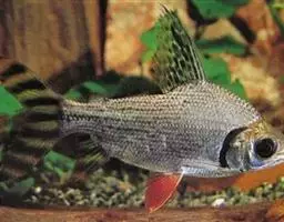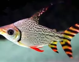 体侧上部有红、黄杂斑,下腹部较白,背有浅褐 色斑。背鳍、胸鳍透明有红色斑点,臀鳍透明无斑,尾鳍上、下叶黄色透明,有若干横斑。体呈筒状延长,下颔略前突。背鳍位于胸鳍基底上方略后,臀鳍上方有一脂鳍。背鳍软条11至13枚;臀鳍软条8至10枚。侧线鳞片数目约在56至61枚之间,以59枚居多。体长可达40厘米。