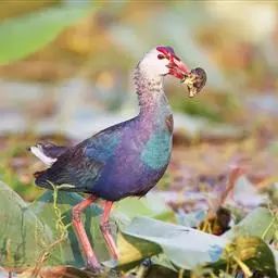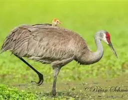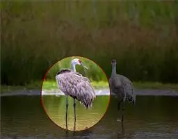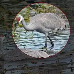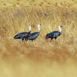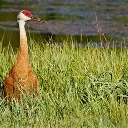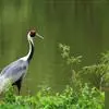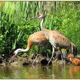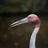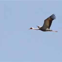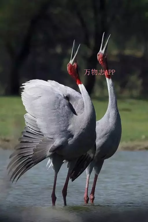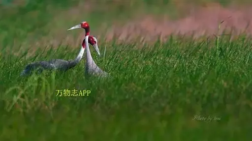 赤颈鹤(Sarus Crane)是大型涉禽,共分化为3个亚种。后趾小而高位,不能与前三趾对握,因此不能栖息在树上;全身羽毛大致呈浅灰色,成鸟颈部裸露红色的皮肤。初级飞羽和初级覆羽为黑色,白色而修长的内侧飞羽垂直的覆盖着尾部。嘴灰绿而脚粉红。栖息于多草的平原、水田、沼泽湿地及森林边缘。以稻谷及水生植物的根、块茎为食,也取食鱼类和蛙类。7-12月份繁殖,筑巢于沼泽地带成团的植物丛中,以水生植物茎、叶筑成。每窝产卵2枚,绿色或粉红白色,具褐色和紫色斑点。雌鸟孵卵,雄鸟守卫,孵卵期30天,由双亲共同照料幼雏。分布于印度、缅甸、泰国、马来西亚、澳大利亚和中国的云南盈江和西双版纳等地。