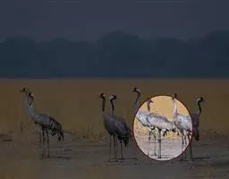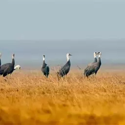 蓑羽鹤大型涉禽,体长68~92厘米,是鹤类中个体最小者。通体蓝灰色,眼先、头侧、喉和前颈黑色,…