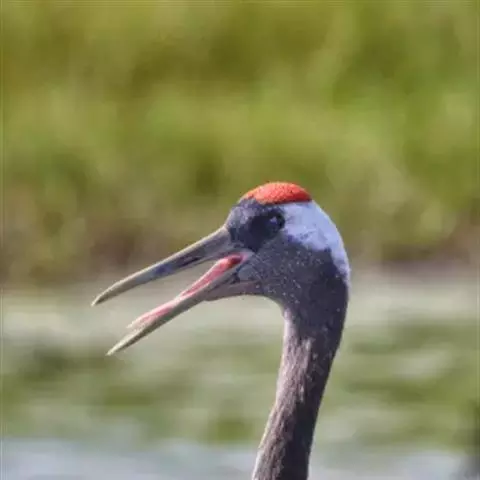 叫声:响亮而持久的喇叭声,通常成对地日夜于地面或飞行时鸣叫。叫时颈伸直,嘴朝向天空。
