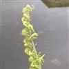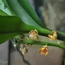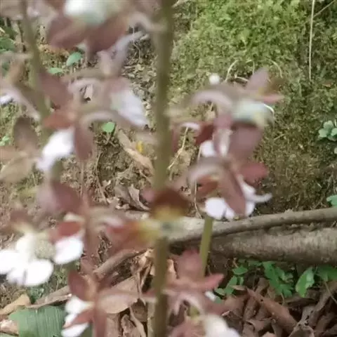 总状花序从叶腋中发出,约等长于叶,下垂,密集许多小花;花序轴肉质,具肋棱;花苞片黄绿色,披针形,长1.5-2.5毫米,向先端急尖;花梗和子房紫褐色,长4-5毫米,子房较粗,弧曲;花稍肉质,不甚伸展,萼片洋红色;中萼片卵形,长2.5毫米,宽1.5毫米,先端钝;侧萼片斜倒卵形,长、宽均为2.5毫米,先端钝,背面中肋多少龙骨状隆起。