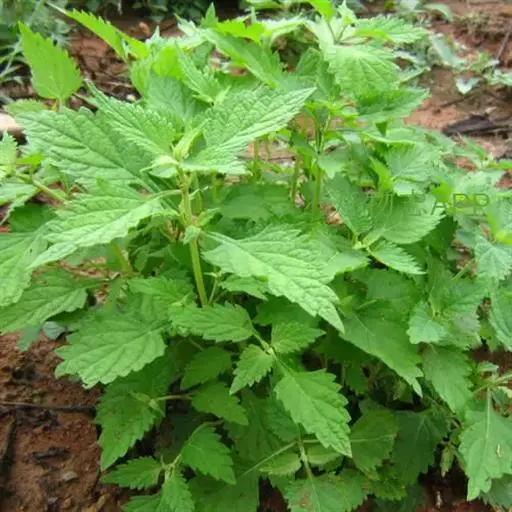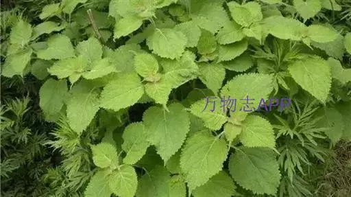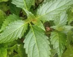 茎叶对生,卵圆形或菱状卵圆形,长2-6厘米,宽1.3-3厘米,先端锐尖或渐尖,后一情况顶端一齿较长,基部宽楔形,骤然渐狭下延成假翅,边缘具粗圆齿状锯齿,齿尖具胼胝体,膜质至坚纸质,上面榄绿色,疏被小疏柔毛及腺点,有时近无毛,下面淡绿色,密被灰白色短绒毛至近无毛,侧脉3-4对,两面十分明显,脉纹常带紫红色;叶柄连具翅假柄在内长1-3.5厘米,向茎、枝顶部渐变短。