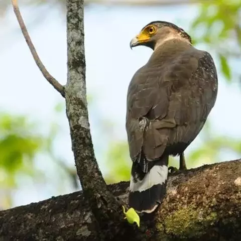 鹰雕,是隼形目鹰科鹰雕属大型猛禽,俗称熊鹰、赫氏角鹰。其上体暗褐色,头后冠羽常竖立起,…