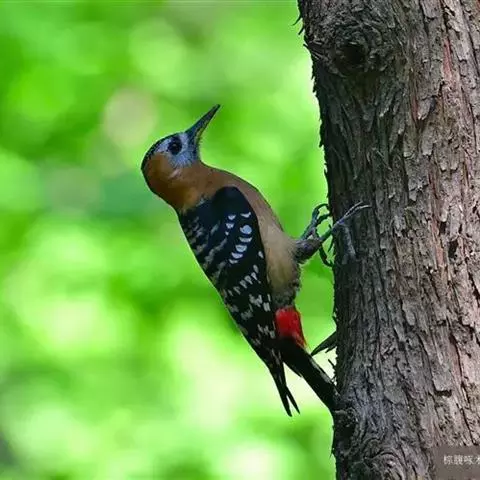 棕腹啄木鸟为啄木鸟科,啄木鸟属是中等体型的鸟类,体长约20厘米。头顶部具红色斑带。脚强健,有趾4个,…