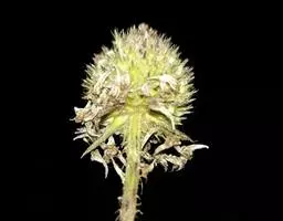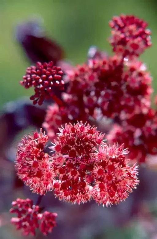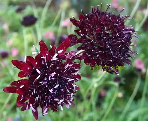 头状花序单生分枝顶端,圆头状,径4-5厘米;总苞苞片2层,12-14片,内层较短,长8-12毫米,披针形,先端渐尖,密生白色短柔毛;小总苞筒状,长约6毫米,基部钝圆,疏生长硬毛,上部扩大成花篮状,全长具8条纵肋,肋弯拱,上部肋间显膜质,顶端分为8个圆裂片,裂片边缘棱状,冠部小,反卷;萼刺刚毛5条,棕黄色,长约8毫米,上面具短毛;花冠紫黑色、淡红色至白色,边花大,筒部漏斗形,长约10毫米,外面密生白色柔毛,裂片5,长圆形,不等大,长7-8毫米;雄蕊4,与花冠近等长;子房包于小总苞内,花柱伸出花冠筒外,柱头头状。果序长卵形或长圆形,长4.5厘米,宽3.5厘米(连萼刺)。花期6-7月。