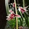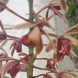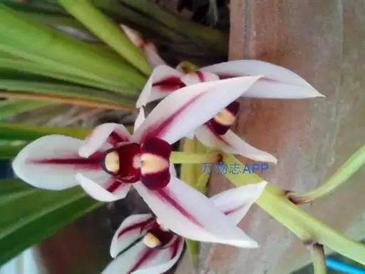 花葶自假鳞茎基部穿鞘而出,长18-35厘米,下弯或下垂;总状花序具5-9朵花;花苞片近三角形,长4-5毫米;花梗和子房长1-2厘米,后期继续延长;花直径4-5厘米,一般无香气;萼片与花瓣白色或奶油黄色,中央有1条栗色纵带自基部延伸到上部3/4处或偶见整个瓣片充满淡枣红色,唇瓣仅在基部和中裂片中央为白色,基余均为栗色,侧裂片则密具栗色脉,褶片呈白色或奶油黄色;萼片狭长圆状椭圆形,长2.2-2.7厘米,宽5-7毫米;