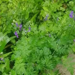 大花还亮草 还亮草:茎高(12-)30-78厘米,无毛或上部疏被反曲的短柔毛,等距地生叶,分枝。叶为二至三回近羽状复叶,间或为三出复叶,有较长柄或短柄,近基部叶在开花时常枯萎;叶片菱状卵形或三角状卵形,长5-11厘米,宽4.5-8厘米,羽片2-4对,对生,稀互生,下部羽片有细柄,狭卵形,长渐尖,通常分裂近中脉,末回裂片狭卵形或披针形,通常宽2-4毫米,表面疏被短柔毛,背面无毛或近无毛;叶柄长2.5-6厘米,无毛或近无毛。总状花序有(1-)2-15花;轴和花梗被反曲的短柔毛;基部苞片叶状,其他苞片小,披针形至披针状钻形,长2.5-4.5毫米;花梗长0.4-1.2厘米;小苞片生花梗中部,披针状线形,长2.5-4毫米;花长1-1.8(-2.5)厘米;萼片堇色或紫色,椭圆形至长圆形,长6-9(-11)毫米,外面疏被短柔毛,距钻形或圆锥状钻形,长5-9(-15)毫米,稍向上弯曲或近直;花瓣紫色,无毛,上部变宽;退化雄蕊与萼片同色,无毛,瓣片斧形,二深裂近基部;雄蕊无毛;心皮3,子房疏被短柔毛或近无毛。蓇葖长1.1-1.6厘米;种子扁球形,直径2-2.5毫米,上部有螺旋状生长的横膜翅,下部约有5条同心的横膜翅。3-5月开花。