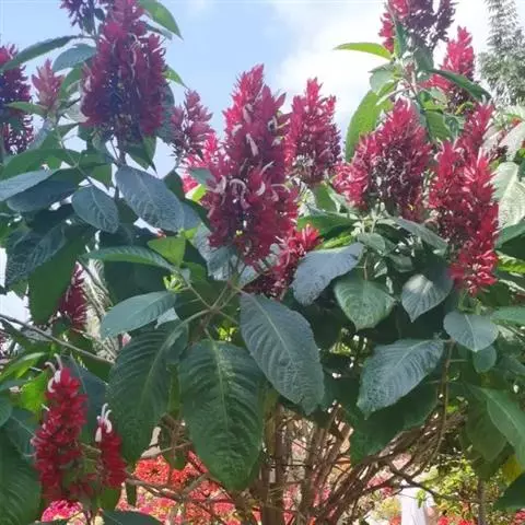 常绿直立亚灌木,丛生,株高50~90cm,叶对生,羽状分裂或浅裂。花絮蕙状,顶生,苞片大,小花多数,白至褐红色,形似鸭嘴,花冠2唇,上唇极小而成单唇状,下唇大,伸展。蒴果。花期春季,果期夏季。