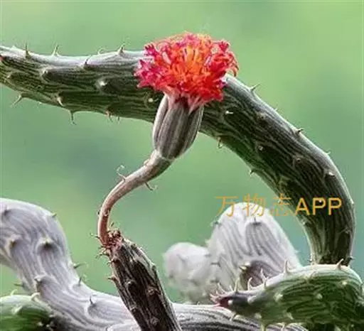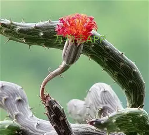 泥鳅掌 植株呈矮小的肉质灌木状,茎圆筒形,两头略尖,匍匐性,接触土壤即生根。平卧于地上,具节,每节长10~30厘米,直径1.5~2厘米,表皮灰绿或褐色,有深绿色线状纵条纹。叶线形,0.2厘米长,早干枯,但干枯后并不脱落,而是宿存在变态茎上,如同小刺。总花梗上有头状花序1~2朵,直径3厘米,花橙红或血红色。