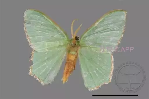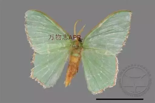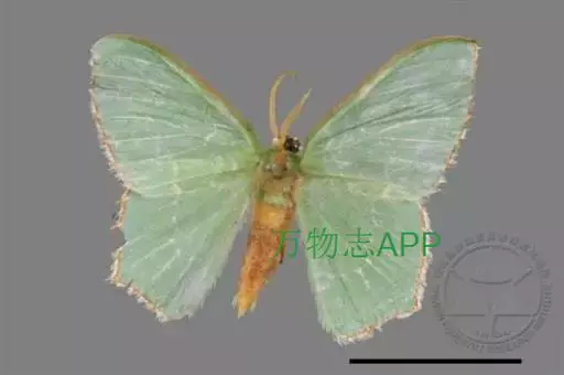 前翅长9mm。雄触角双栉形,雌锯齿形。下唇须短小细弱,红褐色。额红褐色。头顶和胸腹部背面黄白色。雄后足胫节具毛束,仅1对端距。翅黄绿色,隐见白色外线,波状;后翅外线中部外凸;前翅内线极弱或消失,有时可见极弱暗色中点;缘线鲜红褐色,在翅脉端间断;缘毛黄白色,在翅脉端红褐色,但在前翅顶角至 M2脉和后翅M2各脉端红褐色大部或全部消失。翅反面色较浅,缘线同正面。后翅外缘在M3处形成凸角,在M1处形成较小凸齿,2齿间凹。