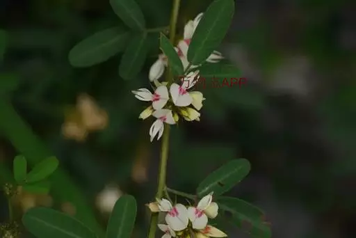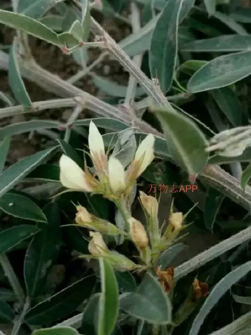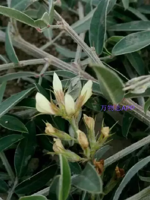 小灌木,高达1米。茎通常稍斜升,单一或数个簇生;老枝黄褐色或赤褐色,被短柔毛或无毛,幼枝绿褐色,有细棱,被白色短柔毛。羽状复叶具3小叶;托叶线形,长2-4毫米;叶柄长1-2厘米;小叶长圆形或狭长圆形,长2-5厘米,宽5-16毫米,先端圆形或微凹,有小刺尖,基部圆形,上面无毛,下面被贴伏的短柔毛;顶生小叶较大。总状花序腋生。较叶短或与叶等长;总花梗密生短柔毛;小苞片披针状线形,有毛;花萼5深裂,外面被白毛,萼裂片披针形,先端长渐尖,成刺芒状,与花冠近等长;花冠白色或黄白色,旗瓣长圆形,长约1厘米,中央稍带紫色,具瓣柄,翼瓣长圆形,先端钝,较短,龙骨瓣比翼瓣长,先端圆形;闭锁花生于叶腋,结实。荚果小,倒卵形或长倒卵形,长3-4毫米,宽2-3毫米,先端有刺尖,基部稍狭,两面凸起,有毛,包于宿存花萼内。花期7-8月,果期9-10月。 [1-2]