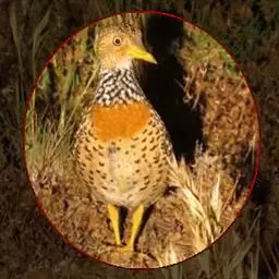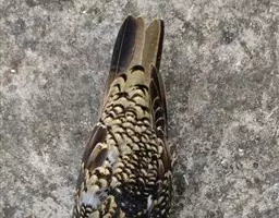 幼鸟上体自额至尾上覆羽,包括两翅的内侧覆羽均棕褐色,各羽具浅白色羽干纹。颏、喉中央棕白,缀以少许褐色斑,喉侧、胸和上腹等棕白微染栗色,各羽端缀以棕褐色矢状斑;两胁、下腹和覆腿羽均乌棕色,微缀以棕白色羽干纹;尾下覆羽暗褐色。
